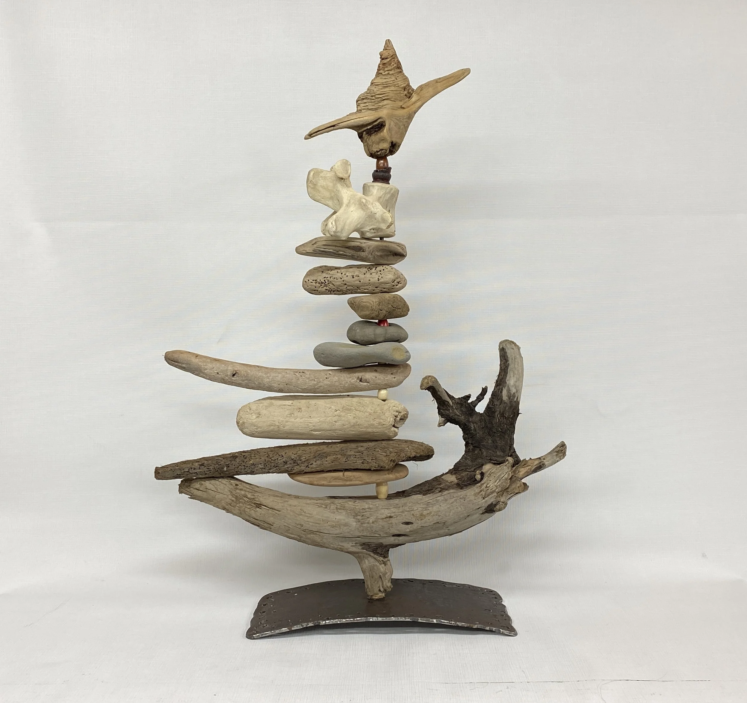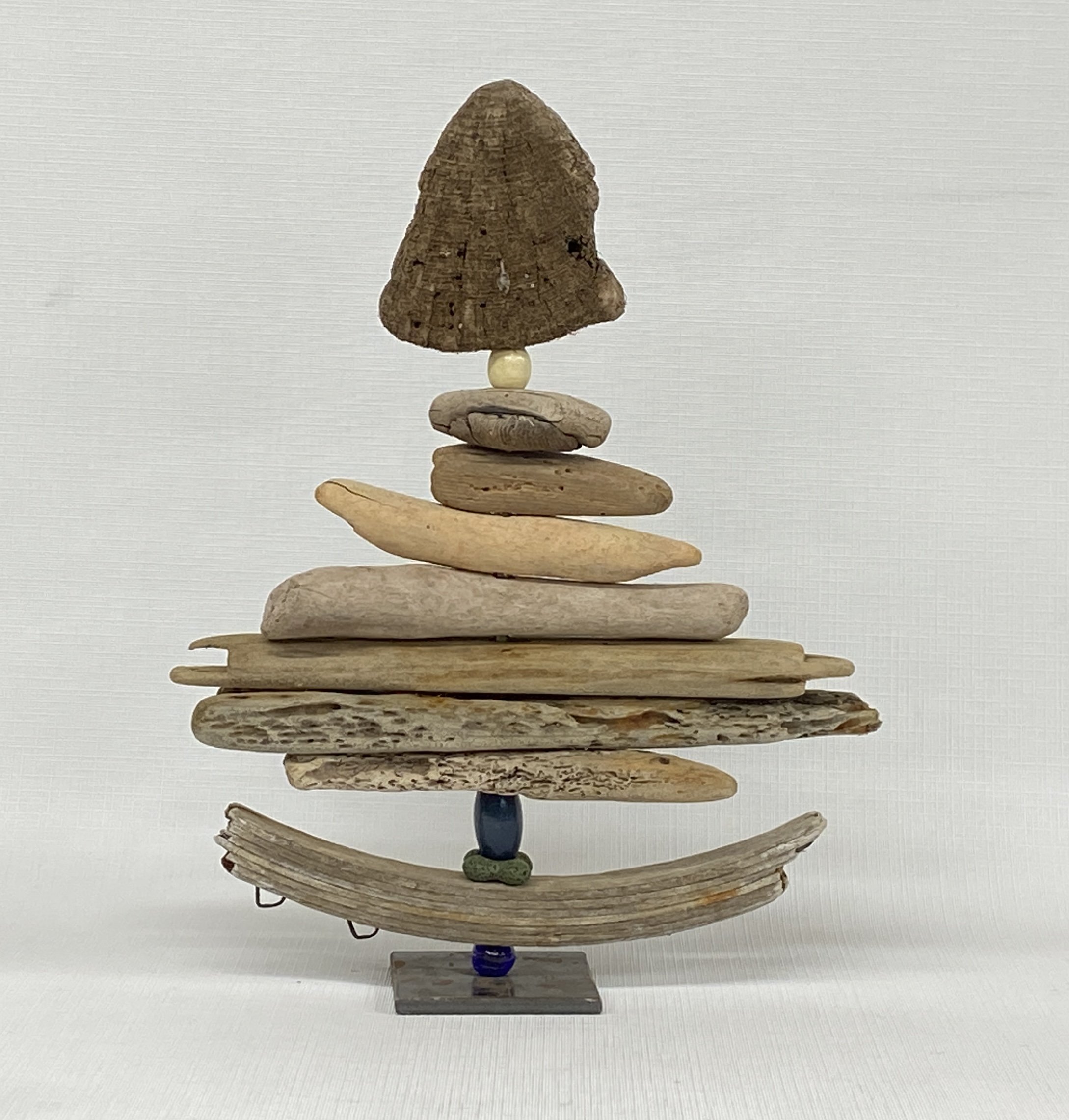 Chaque voilier est monté sur une base et tige de métal. Étienne choisi d’abord le morceau de bois qui servira de “base” et sélectionne par la suite des morceaux de bois de dunes, coquillages, roches, ossements, perles et les enfilent un par un afin de composer son voilier. Chaque morceau à été ramassé lors d’une des multiples promenades à la plage, le tout est ensuite trié et classé selon sa forme et grosseur. Les bois de dunes sont utilisés tel qu’il les retrouvent sur la plage, il perce chaque morceau à un endroit spécifique et laisse ensuite aller sa créativité…